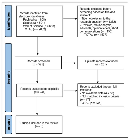 For articles advancing to full-text review, the same two reviewers (Z.L.P. and F.B.) conducted an in-depth evaluation to confirm eligibility based on the predefined criteria. Data extraction and management were performed manually, ensuring a systematic approach to synthesizing evidence from selected studies. From a total of 525 records that were screened, 281 were duplicated, 58 did not have available data, and the other 236 articles did not match the inclusion criteria, leaving a total of 8 studies included in the final analysis, as presented in Figure 1.