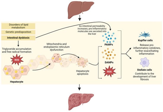 A combination of the aforementioned hypotheses suggests that genetic predisposition, disorders of lipid metabolism, and intestinal dysbiosis shift the balance from anti-inflammatory to pro-inflammatory signaling. This may impair gut motility and intestinal barrier function [13], thereby promoting the gradual accumulation of triglycerides in hepatocytes and the formation of free radicals. This oxidative stress subsequently causes mitochondrial and endoplasmic reticulum dysfunction, resulting in hepatocyte apoptosis. Further inflammation may be driven by the formation of additional ROS and exposure to gut-derived pathogen-associated molecular patterns (PAMPs) and damage-associated molecular patterns (DAMPs) as the intestinal tract becomes increasingly leaky. Finally, these stimulate the activation of both Kupffer cells, which further release pro-inflammatory cytokines, and stellate cells, which contribute to liver fibrosis (Figure 1) [13].