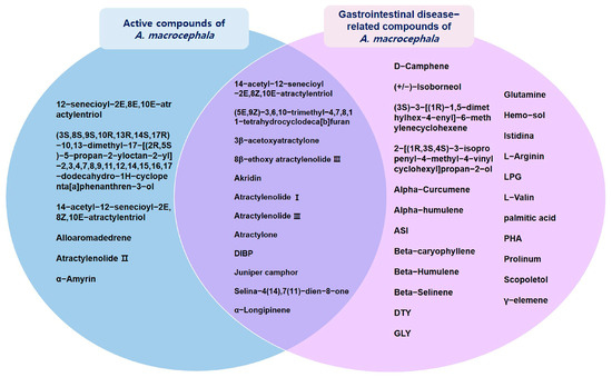 The association between the AMK compound and target and disease was investigated. Overall, 35 compounds were involved in GI disease (Table 2), 12 of which were active compounds (Figure 2).