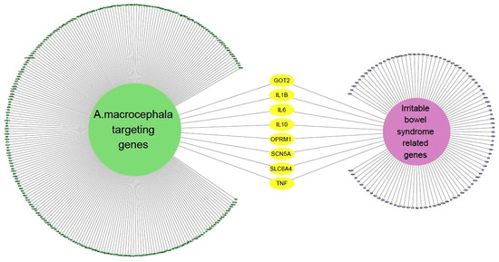 We identified 100 genes associated with IBS by applying a confidence threshold of 0.40 for up to 100 proteins (Supplementary Material Table S1). Next, we made a network containing IBS-related genes and AMK target genes (Figure 3), which revealed the presence of eight genes common to both gene sets.