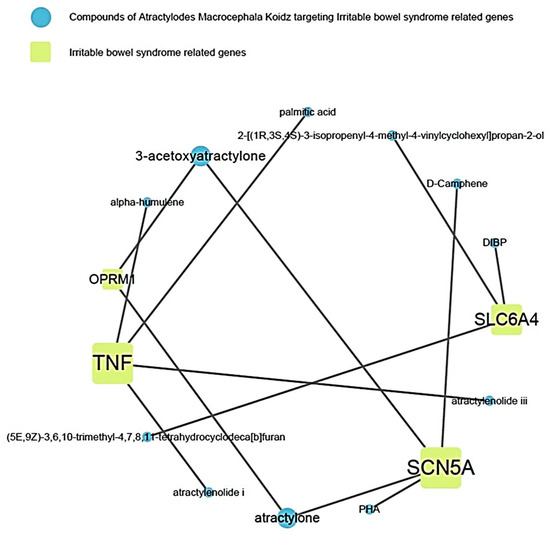 This showed the relationship between the active compound of AMK and the target gene related to IBS (Figure 4). Among them, it showed that TNF and SCN5A were the most related to IBS.
