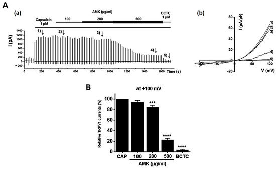 Effects of AMK extract on TRPV4 currents. (A) (a) Representative trace for TRPV4 showing the effect of 100, 200, and 500 μg/mL AMK extract. TRPV4 was overexpressed in HEK293T cells. (b) I–V representative curve showing the effect of 100, 200, and 500 μg/mL AMK extract. (B) Statistical analysis. After inward ITRPV4 establishment using GSK101A, relative ITRPV4 using 100, 200, and 500 μg/mL AMK extract and the inhibitor RR are shown (at +100 mV). The results are represented as mean ± SE. **** p < 0.0001 indicates statistical significance relative to the naïve.