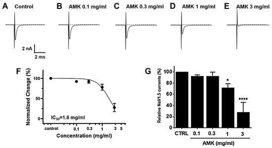 Effects of AMK extract on NaV1.5 currents. (A) Representative plot showing the NaV1.5 currents in HEK293T cells. (B) Representative plot showing the effects of 0.1 mg/mL AMK extract. (C) Representative plot showing the effects of 0.3 mg/mL AMK extract. (D) Representative plot showing the effects of 1 mg/mL AMK extract. (E) Representative plot showing the effects of 3 mg/mL AMK extract. (F) Inhibition of NaV1.5 by AMK extract. (G) Statistical analysis. IC50 = 1.8 mg/mL. The results are represented as mean ± SE. * p < 0.05 and **** p < 0.0001 indicate statistical significance relative to the control group. CTRL: Control.