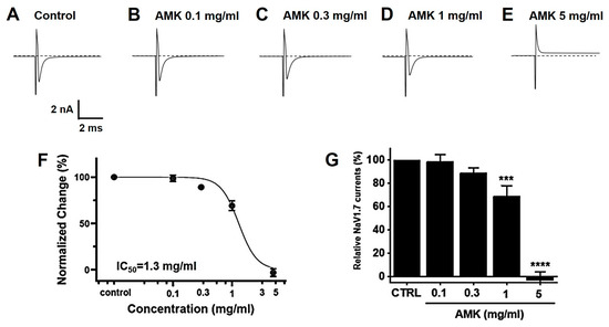 Effects of AMK extract on NaV1.7 currents. (A) Representative plot showing the NaV1.7 currents in HEK293T cells. (B) Representative plot showing the effects of 0.1 mg/mL AMK extract. (C) Representative plot showing the effects of 0.3 mg/mL AMK extract. (D) Representative plot showing the effects of 1 mg/mL AMK extract. (E) Representative plot showing the effects of 3 mg/mL AMK extract. (F) Inhibition of NaV1.7 by AMK extract. (G) Statistical analysis. IC50 = 1.3 mg/mL. The results are represented as mean ± SE. *** p < 0.001 and **** p < 0.0001 indicate statistical significance relative to the control group. CTRL: Control.