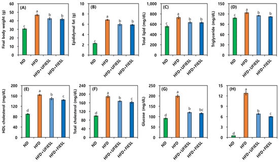 Comparison of body weight, epididymal fat, and serum biomarkers by the diet of unfermented and fermented isoflavone-enriched soybean leaves. (A) Final body weight; (B) epididymal fat; (C) total lipid; (D) triglyceride; (E) HDL cholesterol; (F) total cholesterol; (G) glucose; (H) leptin. Samples: ND, normal diet; HFD, high-fat diet; HFD + UFIESL, HFD and unfermented isoflavone-enriched soybean leaves; HFD + FIESL, HFD and fermented isoflavone-enriched soybean leaves. All values are presented as the mean ± SD (n = 6). Values of different letters are significantly different on the bars (p < 0.05).