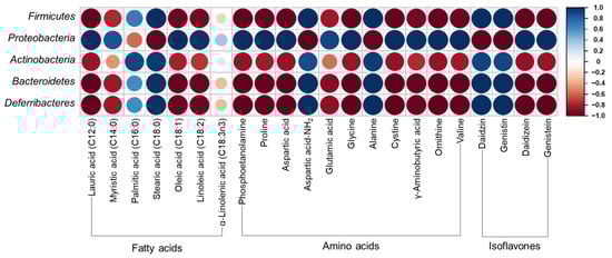 Figure 5 shows Pearson’s correlation matrix calculated from the relative abundance of gut microbiota and selected high-content metabolite compounds. Proteobacteria showed a high positive correlation with lauric acid, myristic acid, oleic acid, linoleic acid, phosphoetanolamine, proline, aspartic acid, glutamic acid, glycine, cystine, γ-aminobutyric acid, ornithine, valine, daidizein, and genistein. Firmicutes, Actinobacteria, Bacteroidetes, and Deferribacteres showed a contrary correlation with Proteobactera, that is, a negative correlation with the aforementioned compounds.