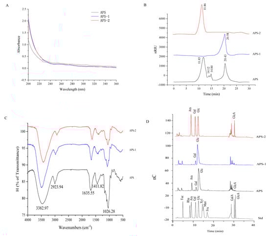 In the UV spectra of Figure 1A, APS, APS-1, and APS-2 exhibited no absorption peak at 260 and 280 nm, implying the presence of little or no nucleic acid and protein. In Figure 1B, HPGPC analysis revealed that four significant peaks were observed in APS and the average molecular weight of these four components were about 1928.54 kDa, 396.31 kDa, 239.92 kDa, and 4.87 kDa, respectively. The average molecular weights were about 4.39 and 1915.15 kDa for the purified APS-1 and APS-2, respectively.