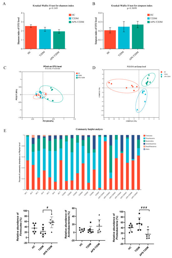 Effects of APS on gut microbiota structure of T2DM patients. (A) Shannon index. (B) Simpson index. (C) PCoA analysis. (D) PLS-DA analysis. (E) Taxonomic analysis of samples at phylum levels. # p < 0.05, ### p < 0.01 vs. T2DM group, n = 7. Black Circles represent HC, black squares represent T2DM, and black triangles represent APS-T2DM.
