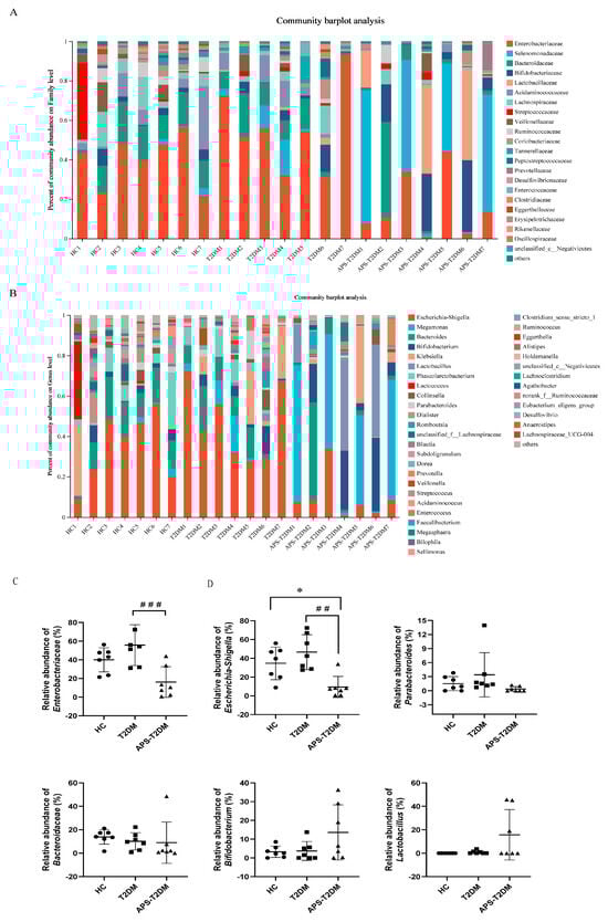 Effects of APS on intestinal microbiota composition in T2DM patients at family and genus levels. (A) Gut microbial composition at the family level. (B) Gut microbial composition at the genus level. (C) Relative abundance analysis of gut microbiota at the family level. (D) Relative abundance analysis of gut microbiota at the genus level. ## p < 0.01, ### p < 0.001 vs. T2DM group, and * p < 0.05 vs. HC group, n = 7. Black Circles represent HC, black squares represent T2DM, and black triangles represent APS-T2DM.