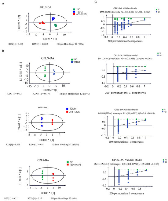 Analyses of metabolites in in vitro fermentation samples by GC-MS and HPLC-MS. (A) The OPLS-DA plot of three groups. (B) OPLS-DA plots of T2DM vs. HC, APS-T2DM vs. T2DM, and APS-T2DM vs. HC. (C) OPLS-DA validation plot (n = 200).