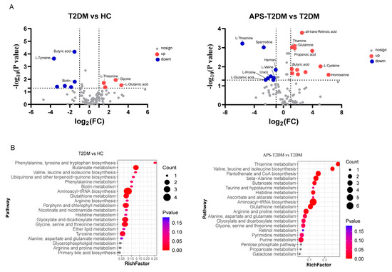 Compounds with significant differences were further screened (Table S4), and some differential metabolites are shown in Figure 5. The T2DM group was significantly lower than the HC group in butyric acid and biotin and was significantly higher in L-threonine, L-glutamic acid, glycine, and guanine. In contrast with the T2DM group, APS fermentation significantly decreased the levels of L-valine, L-proline, L-threonine and L-glutamic acid, and spermidine, while the levels of all-trans-retinoic acid, glutamine, thiamine, butyric acid, and propanoic acid were elevated. The functions of these differential metabolites were determined by KEGG pathway enrichment analysis. In Figure 5B, L-valine, L-threonine, L-proline, and L-tyrosine were shown to be enriched in the pathways of aminoacyl-tRNA biosynthesis, phenylalanine, tyrosine and tryptophan biosynthesis, and proline metabolism, while butyric acid and thiamine were found to be mainly enriched in the pathways of butanoate metabolism and thiamine metabolism.