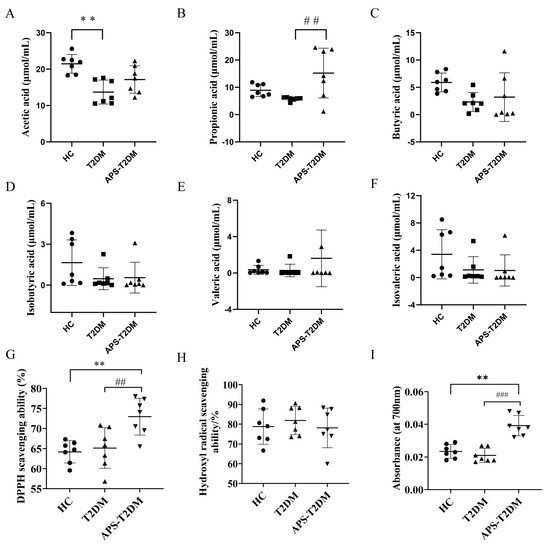 Effects of APS on the levels of SCFAs and antioxidant activities in the feces of T2DM patients after in vitro fermentation. (A) Acetic acid. (B) Propionic acid. (C) Butyric acid. (D) Isobutyric acid. (E) Valeric acid. (F) Isovaleric acid. (G) DPPH- scavenging rate. (H) Hydroxyl radical scavenging rate. (I) Reduction ability. ## p < 0.01 vs. ### p < 0.001 vs. T2DM group. ** p < 0.01 vs. HC group; Black Circles represent HC, black squares represent T2DM, and black triangles represent APS-T2DM. n = 7.