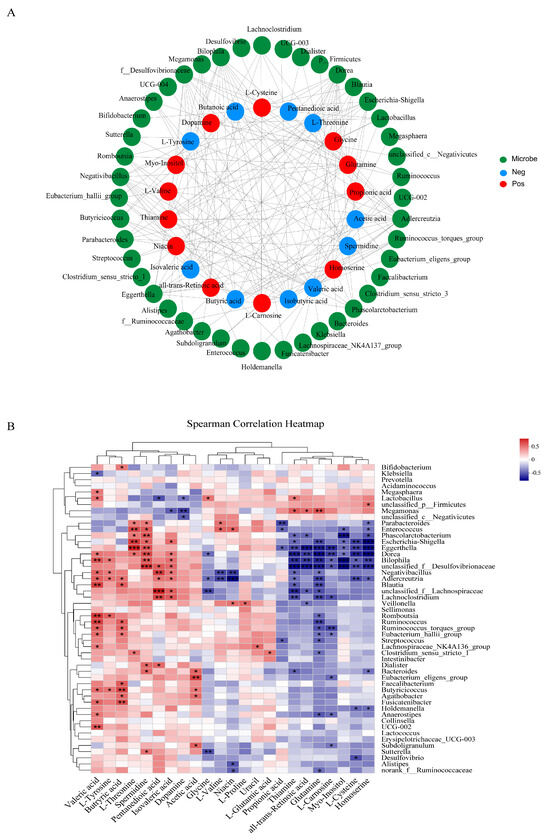 Spearman correlation analysis. (A) Network analysis of correlations between metabolites and the top 45 most abundant gut microorganisms at the genus level, with green for microbe, red for positive correlation, and blue for negative correlation. (B) Heatmap analysis of correlations between metabolites and microbiota at the genus level, with the color from red to blue in the heatmap representing changes of the R values of Spearman’s correlations from greater to lower. * 0.01 < p ≤ 0.05, ** 0.001 < p ≤ 0.01, and *** p ≤ 0.0001.