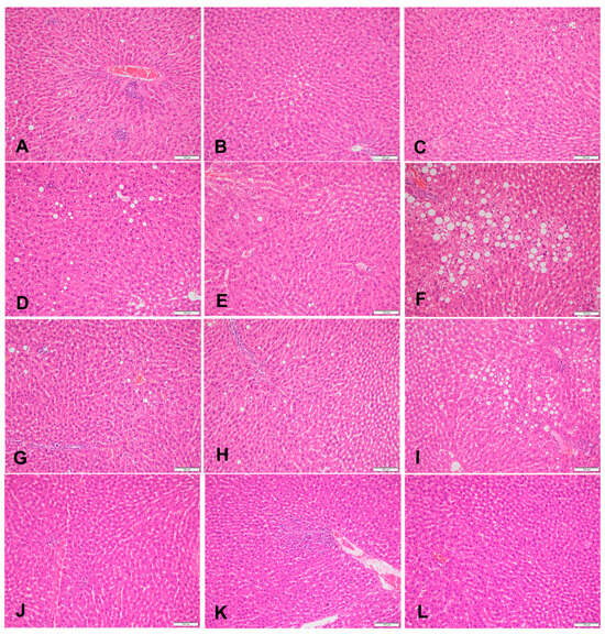 Sections of liver in (A–C) a rat fed the control diet (H&E, 200×), (D–F) area of microvesicular steatosis in a rat fed a high-fructose diet (H&E, 200×), (G–I) sections of liver of a rat fed a high-fructose diet and 5% spirulina (H&E, 200×), and (J–L) sections of liver of a rat fed a high-fructose diet and 10% spirulina (H&E, 200×).