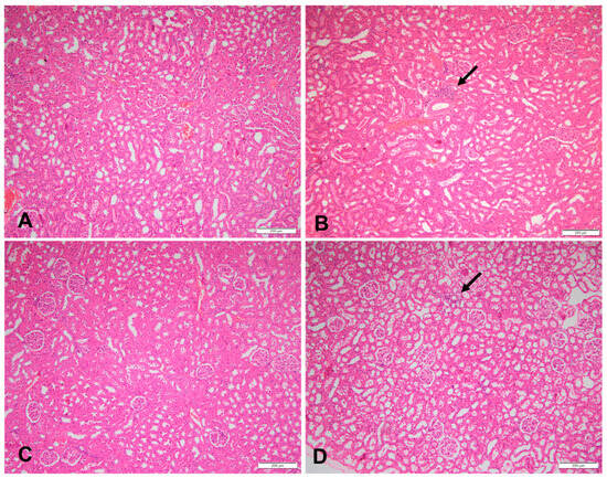 Sections of a kidney in (A) a rat fed the control diet (H&E, 100×), (B) area of inflammation in a rat fed a high-fructose diet (the arrow) (H&E, 100×), (C) sections of a kidney of a rat fed a high-fructose diet and 5% spirulina (H&E, 100×), and (D) sections of a kidney with an area of inflammation (the arrow) in a rat fed a high-fructose diet and 10% spirulina (H&E, 100×).