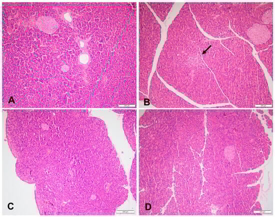 Sections of a pancreas in (A) a rat fed the control diet (H&E, 100×), (B) area of pancreas inflammation, (the arrow), in a rat fed a high-fructose diet (H&E, 100×), (C) sections of a pancreas of a rat fed a high-fructose diet and 5% spirulina (H&E, 100×), and (D) sections of a pancreas of a rat fed a high-fructose diet and 10% spirulina (H&E, 100×).