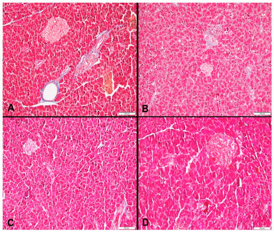 Plasma was separated by centrifugation (1000× g; 5 min) immediately after collection and stored at −80 °C until analysis. Fragments of the rat’s liver, kidney, and pancreas were selected randomly, removed, and sent to the pathology laboratory for histological examination. The liver fragments were fixed in 10% formalin, routinely processed, and embedded in paraffin. Sections of 3 μm were cut from the paraffin block and stained with hematoxylin and eosin (H&E). Picrosirius red staining was performed to evaluate the degree of portal and peri-sinusoidal fibrosis in the tissue. Frozen liver sections were used to evaluate steatosis by staining with oil-red O [].