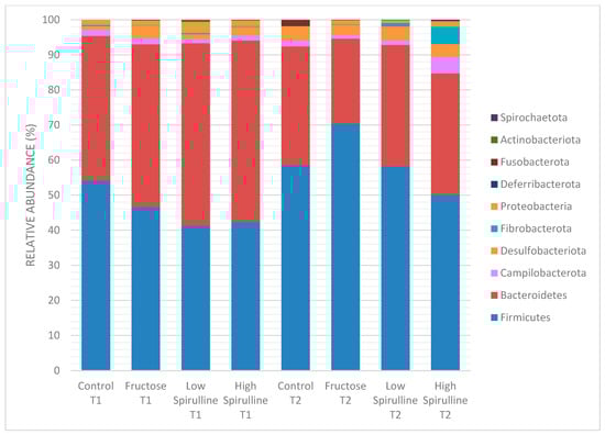 Variation of the different bacterial phyla (%) in each group at time 1 (week 1) and time 2 (week 18). Low spirulina; HFr-S5, High spirulina; HFr-S10.