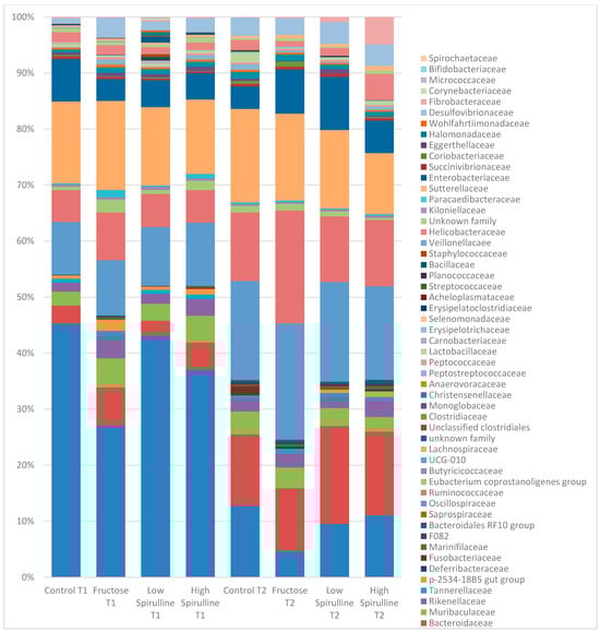 Variation of the different bacterial families (%) in each group at time 1 (week 1) and time 2 (week 18). Low spirulina; HFr-5; High spirulina; HFR-S10.