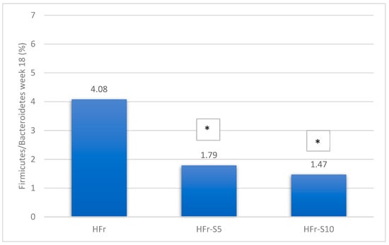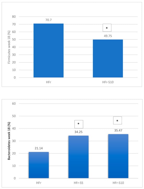 A significant decrease in Bacteroidetes phylae was observed in all groups at week 18, mainly in the HFr group (Figure 8). On the other hand, at the same period, the Firmicutes phylae increased significantly in the HFr group compared to other groups (p < 0.05) (Figure 8). At week 18, the average ratio of Firmicutes/Bacteroidetes in the HFr group was significantly different from the HFr-S10 groups (Figure 8).