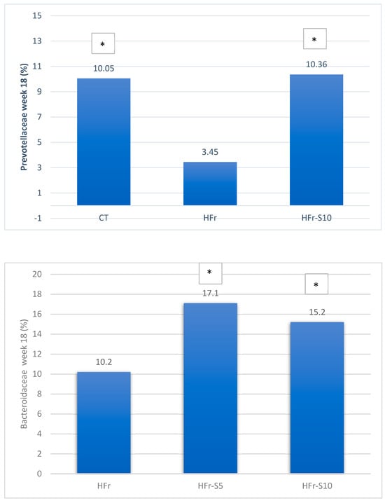 At week 18, at the family level, the average percentages of Prevotellaceae were significantly reduced in the HFr group compared to the HFr-S10 and CT groups (p < 0.05), and the family Bacteroidaceae showed a significant increase in both groups HFr-S5 and HFr-S10 compared to the HFr group (Figure 9). According to the Ruminococcoceae family, the HFr group was significantly higher than the HFr-S10 group at week 18 (Figure 9). Similarly, there was a significant increase in Fibrobacteraceae in the HFr-S10 within times and compared to the HFr group at week 18 (Figure 9).