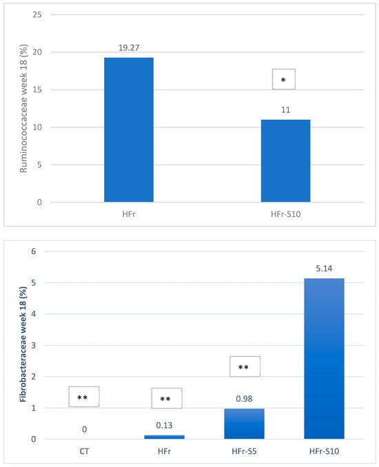 Variation of the mean of the different bacterial families (%) between and within groups (week 1–week 18). * p < 0.05 when compared with HFr. ** p < 0.05 when compared with HFr-S10.
