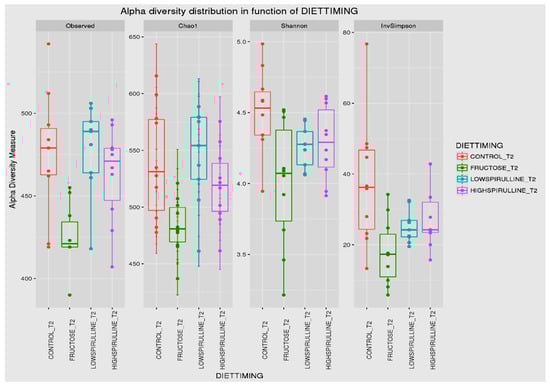 Box plot showing the alpha diversity of the IM within each group between time 1 (week 1) and time 2 (week 18), expressed by the Shannon, Chao 1, and Observed diversity indices.