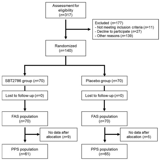 A flowchart of participation is shown in Figure 1. A screening test was conducted on 317 candidates who provided consent to participate in the trial, wherein 140 participants were selected. These participants were randomly assigned to two groups (SBT2786 and placebo groups, n = 70) and consumed the test food. During the consumption period, there were no participant dropouts, the consumption rate of the test food was 100%, and all 140 participants completed the trial. Therefore, these 140 participants constituted the full analysis set (FAS) and were subjected to safety analyses. However, 14 participants (nine from the SBT2786 group and five from the placebo group) were unable to obtain the prescribed number of EEG data (2 days or more) due to noise. The remaining 126 participants (61 from the SBT2786 group and 65 from the placebo group) underwent the per protocol set (PPS) and were analyzed for the primary and secondary outcomes.