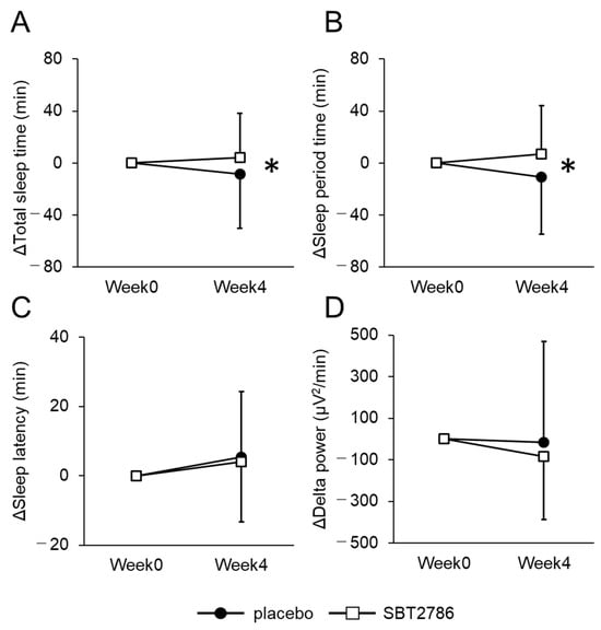 Changes in EEG-derived sleep parameters in the subgroup analysis. (A) Total sleep time, (B) Sleep period time, (C) Sleep latency, (D) Delta power in SPT. Values are presented as means ± SD. * p < 0.05, significant differences between the SBT2786 and placebo groups (ANCOVA with each initial value as a covariate).