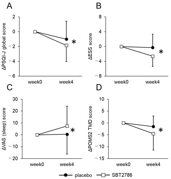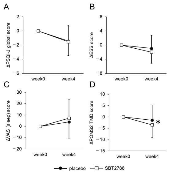 Changes in sleepiness and physical condition in the subgroup analysis. (A) PSQI-J global score, (B) ESS, (C) VAS (sleep), (D) POMS2 TMD score. Values are presented as means ± SD. * p < 0.05, significant differences between the SBT2786 and placebo groups (ANCOVA with each initial value as a covariate).