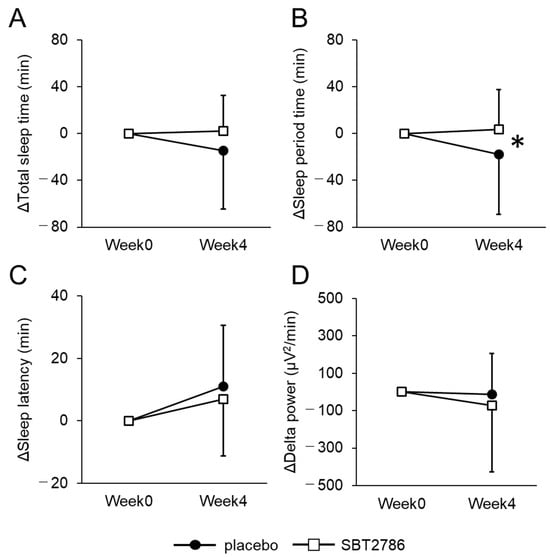 Changes in EEG-derived sleep parameters. (A) Total sleep time, (B) Sleep period time, (C) Sleep latency, (D) Delta power in SPT. Values are presented as means ± SD. * p < 0.05, significant differences between the SBT2786 and placebo groups (ANCOVA with each initial value as a covariate).