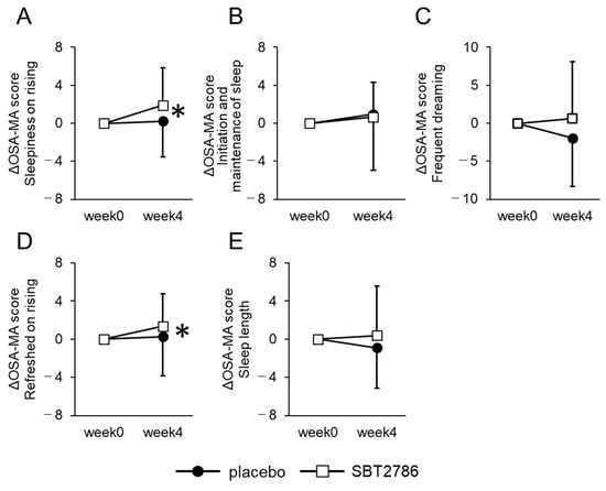 Changes in OSA-MA analysis on sleep quality in the subgroup analysis. (A) Sleepiness on rising, (B) Initiation and maintenance of sleep, (C) Frequent dreaming, (D) Refreshed on rising, (E) Sleep length. Values are presented as means ± SD. * p < 0.05, significant differences between the SBT2786 and placebo groups (ANCOVA with each initial value as a covariate).
