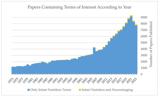 All eligibility criteria and methodologies were developed a priori; these strategies were limited to the English language, and included terms related to both infant nutrition and various neuroimaging techniques. PubMed and ScienceDirect were the electronic databases used to search for relevant papers, and papers selected were manually reviewed for additional citations. All results from search strategies were manually tracked and recorded. Searches were not explicitly restricted by year published, but interest in infant nutrition with respect to neuronal development was rarely studied until the early 2000s (Figure 1). The search strategy involved a combination of infant-diet-and neuroimaging-related terms; “Breast milk” OR “Human Milk” OR “Infant Diet” OR “Infant Nutrition” AND “Neuroimaging” OR “MRI” OR “EEG” OR “MEG” OR “DTI”. The full search terms used in the PubMed database can be found in Figure A1.