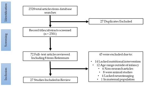 Inclusion and exclusion criteria are detailed in Table 1 using the PICOS format [30]. Studies examining only healthy infants were included; therefore, studies concerning either specific nutritional deficiencies (see [4] for a review) or studies analyzing specific diseases or developmental disorders were excluded. Preterm infants were included due to the potential for diet to have a differential effect on development depending on when a diet or intervention was introduced. Studies involving preterm infants were included if the infants were otherwise healthy (no known congenital abnormalities, illnesses, comorbidities, or expected deviations from normal development) and met all other inclusion criteria. Diets looking at the specific supplementation of a nutrient (L-PUFAS, additionally fatty acids, etc.) in an otherwise healthy diet were included. Reviews, abstracts, studies that were not yet complete, study protocols, and studies that exclusively looked at older children were all considered ineligible. While magnetoencephalography (MEG) was considered as a viable neuroimaging technique since it provides a non-invasive way to measure neuronal activity with a millisecond temporal resolution, no studies were uncovered by our literature search despite its increasing use in infants [31]. Neuroimaging techniques including or encompassing EEG and MRI were included. One reviewer (DG) screened all titles and abstracts of the identified studies from the initial search and determined a preliminary eligibility status. A second reviewer (LLP) independently reviewed the 72 preliminary articles selected for a full-text review and arrived at a consensus with the first author on which papers should be included.