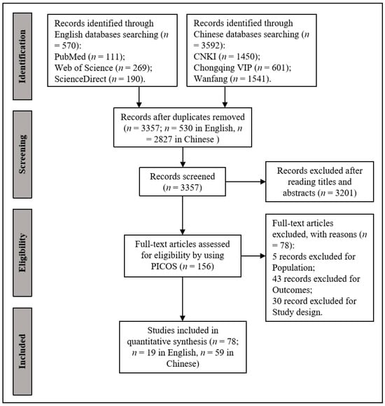 This scoping review was conducted following the Preferred Reporting Items for Systematic Reviews and Meta-Analyses guidelines extension for scoping reviews (PRISMA-ScR) []. The research question was “What is known about the longitudinal changes in minerals and vitamins in human milk throughout lactation in the Chinese population?”. A comprehensive literature search was conducted using three English databases (PubMed, Web of Science, ScienceDirect) and three Chinese databases (China National Knowledge Infrastructure (CNKI), Chongqing VIP Information, and Wanfang). For English databases, the following search strategy was applied: “(human OR breast) AND (milk) AND (mineral* OR vitamin* OR trace element*) AND (quantification OR concentration* OR content*) AND (China OR Chinese)”. For Chinese databases, we optimized the search strategy to (human milk OR breast milk) AND (mineral OR vitamin OR trace element) per the style of Chinese language. The search concluded in August 2022. Duplicate articles were eliminated, and titles and abstracts of the remaining articles were screened for relevance. The full text of the selected articles was then reviewed for qualification according to the criteria set forth in the PICOS framework (Table 1). Moreover, an assessment of the quality of all the included articles was conducted (Supplementary Table S1). Two investigators, Q.R. and K.L., independently conducted the literature search and selection process. Any discrepancies were resolved with the assistance of a third investigator, Q.X.