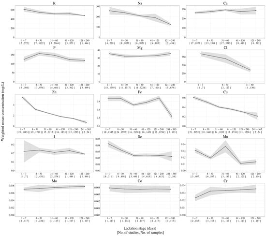 Lactation was categorized into six distinct periods: 1–7, 8–30, 31–60, 61–120, 121–240, and 241–365 postnatal days. Classification of lactation was determined based on the predominant period during which data were gathered. The concentration of elements was summarized in terms of means and standard deviations (SDs). Medians, interquartile rank, and ranges were converted into means as previously described []. A density of 103 g/100 mL was applied for the conversion of mg or μg/g of human milk to mg or μg/L []. Weighted means, SDs, and standard errors (SEs) of elements in each stage of lactation were calculated. The 95% confidence intervals (CIs) for each element across lactation stages were estimated as weighted mean ± t × SE, where t was calculated from a t-distribution with degrees of freedom equivalent to the sample size of the group minus 1. Cochran’s Q statistic from a fixed effect model, where heterogeneity conforms to a X2—distribution with degrees of freedom equal to the number of subgroups minus 1, was conducted. A random effect model was used when significant heterogeneity was observed using the fixed model. The calculation of Higgins and Thompson’s I2 was based on the Q statistic. Figures were produced with the ggplot2 package in R. The statistical computations were carried out utilizing R software (version 4.0.3). Forest plots were constructed to compare element concentrations from the studies included utilizing Stata/SE 14.0 (StataCorp LLC, College Station, TX, USA). Data mining and statistical analysis were independently conducted by two researchers (Q.R. and K.L.). Any discrepancies were resolved with the involvement of a third researcher (Q.X.).