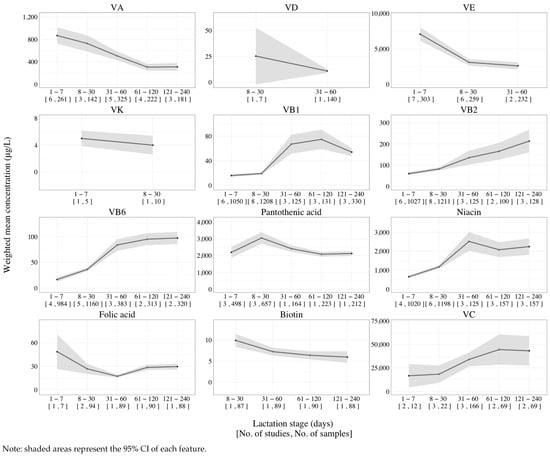 Longitudinal changes in minerals and vitamins were found to be almost identical to those reported in previous studies conducted in other populations, but there are several differences. Two studies conducted in Japan have also examined the changes in mineral and trace element composition in human milk over the lactation period [,]. Specifically, Na, K, Cr, and Zn were found to demonstrate a decreasing trend. Although iron also showed a downward trend, the change was not statistically significant. The trends of Mg and Ca were found to fluctuate slightly throughout lactation. However, our results suggest that there is no significant decline in Cr during lactation, a finding which may be influenced by the fact that only one article on chromium concentration covering the whole lactation period was included in this study. A study by Sakurai T et al. [] demonstrated that the mean concentrations of VA, VE, and VD in Japanese mothers exhibited a decreasing trend during lactation. Similarly, a study conducted on the Brazilian population by Campos JM et al. [] yielded similar findings. Another study by Ford et al. [] revealed that the mean concentrations of VB1, VB6, niacin, pantothenic acid, biotin, and folic acid in British mothers increased progressively with the stage of lactation. This trend was also observed in a study conducted on the Japanese population by Sakurai T et al. []. However, our findings regarding VC in human milk are inconsistent with those reported in non-Chinese populations. Ahmed L Jr et al. [] demonstrated that the concentration of vitamin C in human milk from mothers in Bangladesh is at its peak in colostrum and decreases as lactation progresses (3.52 ± 0.56 mg/dL in colostrum compared to 3.03 ± 0.67 mg/dL in mature milk). A normal distribution is usually extensively and implicitly assumed in meta-analyses [], a fact which is important to consider when interpreting the statistics of this review. This is typically true at the between-study level for random effects models where the central limit theorem is not guaranteed for a large sample size []. In our study, data for VA, VE, VB1, VB2, VC, Na, Zn, Fe, Cu, Se, Mn, Co, and Cr seem to be not normally distributed (p < 0.05) according to the Shapiro–Wilk test (Supplementary Table S5); therefore, the random effects of those features should be interpreted with caution.