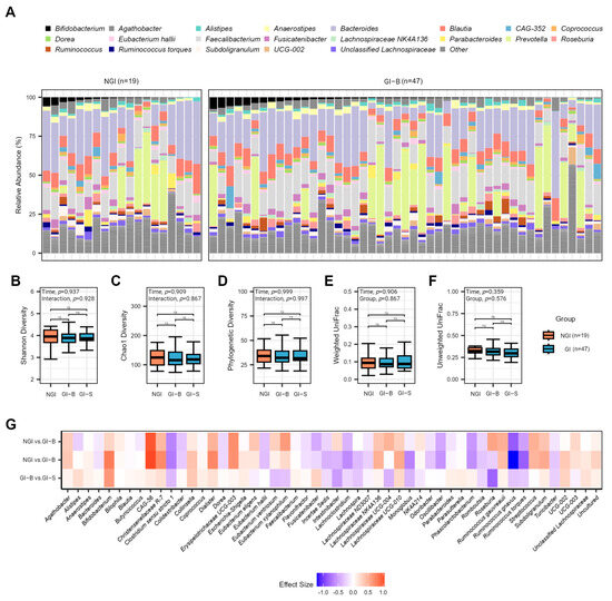 Gut microbiota of NGI and GI subjects (at two different periods listed as GI-B and GI-S). (A) Average relative abundance of the most prevalent genera among study subjects at the baseline periods by 16S rRNA sequencing. Genera with a median relative abundance of less than 1% are collapsed into the category “Other.” No significant effects were detected for alpha diversity metrics, metrics, illustrated by p-values ≤ 0.05, and pairwise non-significant differences are listed as ns; (B) Shannon, (C) Chao1, or (D) PD diversity. In addition, no significant effects were found for intra-individual distances by time or group for (E) weighted UniFrac or (F) unweighted UniFrac beta-diversity metrics. (G) There were no differentially abundant taxa at the phyla, family, and genera levels between groups for merged baseline periods and day 43 of GI-S (genus level displayed). Effect size displayed as beta-coefficient from ANCOM-BC models.