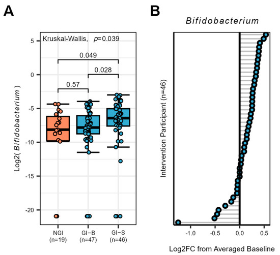 Bifidobacterium response in the gut microbiota of NGI and GI subjects (at two different periods listed as GI-B and GI-S). (A) The genus Bifidobacterium increased at day 43 in GI-S subjects compared to the merged baseline period of GI-B, p-values are listed for each comparison, and those ≤0.05 were considered significant (B) Individualized Bifidobacterium response of GI subjects from the supplementation period (merged baseline GI-B vs. day 43 GI-S), grey lines identify each individual responses illustrated as a circle with blue center.