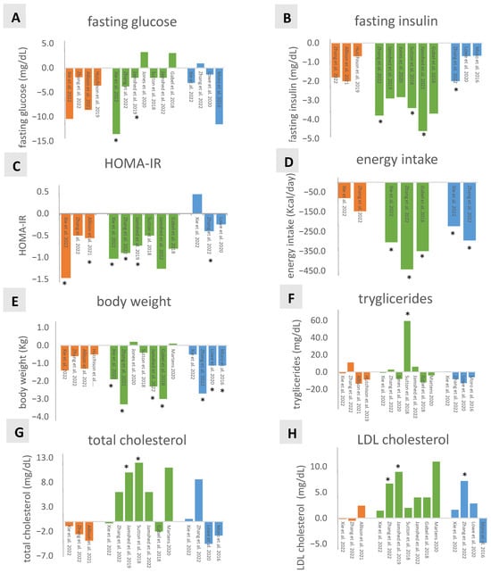 Comparisons (Δ) of the changes in (A) fasting glucose levels, (B) fasting insulin levels, (C) HOMA-IR, (D) energy intake, (E) body weight, (F) triglycerides, (G) LDL cholesterol, (H) total cholesterol, (I) HDL cholesterol, and (J) systolic blood pressure between eTRF, lTRF, and/or control groups. Each bar represents the difference between two arms: orange Δ (eTRF-lTRF), green Δ (eTRF-control), and blue Δ (lTRF-control); [number] is the study reference, * p < 0.05 [,,,,,,,,,,,,].