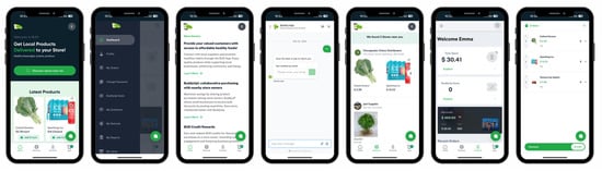 - Lewis, E.C.; Zhu, S.; Oladimeji, A.T.; Igusa, T.; Martin, N.M.; Poirier, L.; Trujillo, A.J.; Reznar, M.M.; Gittelsohn, J. Design of an Innovative Digital Application to Facilitate Access to Healthy Foods in Low-Income Urban Settings. mHealth 2024, 10, 2. [Google Scholar] [CrossRef] [PubMed]