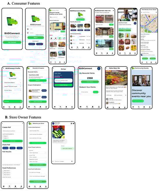 Feature functionality was enhanced, and new features suggested by participants were built into the interface to meet the needs of both consumers (Figure 3A) and corner store owners (Figure 3B). These included a feature for consumers to filter for foods that meet specific dietary restrictions, as well as a feature for corner store owners to create advertisements and push them out to selected app users. During this process, the research team considered the feasibility of optimal back-end programming. Uizard 2024 software for UI (user interface) design [] was used for revisions to the initial high-fidelity wireframe mockups, the result of which can be found in Figure 3.