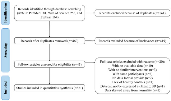 The workflow for the identification and stepwise selection of the studies is presented in Figure 1. Initially, a total of 601 citations (181 from PubMed, 256 from Web of Science, and 164 from Embase) were obtained through database searching. Among them, 141 records were removed for the reason of duplication and 460 articles were included for screening and filtering titles and abstracts, as described in Section 2. After excluding 419 irrelevant records, the remaining 41 articles were retrieved for a full-text review. Among them, 20 articles were excluded for various reasons: 10 failed to provide required data; 3 lacked similar interventions; 2 used the same participants; 2 did not indicate the data format; 1 lacked healthy controls; 1 provided data that cannot be expressed as mean ± SD; and 1 provided data skewed away from normality [16,27,28,29,30,31,32,33,34,35,36,37,38,39,40,41,42,43,44,45]. Finally, the cited references and citations of 21 remaining studies were manually searched, and no other eligible studies were included.