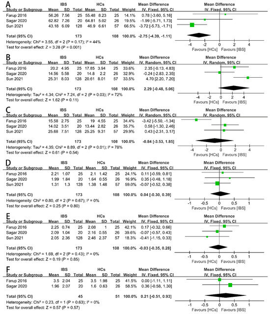 Forest plots of alterations of proportion of fecal SCFAs in IBS patients versus HCs: (A) acetate, (B) propionate, (C) butyrate, (D) iso-butyrate, (E) valerate, and (F) iso-valerate.