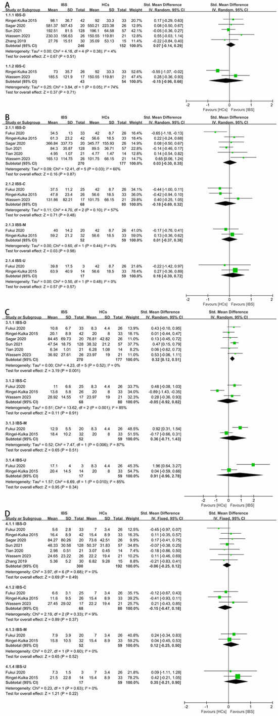 Forest plots of alterations of concentration of fecal SCFAs in IBS subtypes versus HCs: (A) total SCFAs, (B) acetate, (C) propionate, and (D) butyrate.