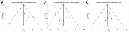 Publication bias among the included studies was assessed and is shown in funnel plots. There was no publication bias for the concentration of acetate (Figure 5A, p = 0.354), propionate (Figure 5B, p = 0.585), and butyrate (Figure 5C, p = 0.287). The publication bias for the other fecal SCFA concentrations was assessed by Egger’s test, and no publication bias was found (Supplementary Table S4). A sensitivity analysis was performed by culling individual studies to analyze the effect on the synthesis result. The synthesis results did not change significantly after removing each study (Supplementary Figure S6 and Supplementary Table S5).