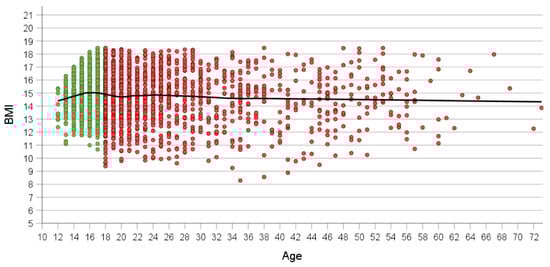 With a peak age of onset between ages 15 and 25 and a mean duration of illness of six years [23], many AN patients experience the transition from child mental health services to adult medicine. In Germany, patients are usually transferred at age 18. The change in treatment ethos from a “protective” approach to a “responsibility” approach [24,25] or the cessation of parental control and support, e.g., a move away from home to attend university [26], represent possible explanations for the drop in BMI in late adolescence/early adulthood and the fact that very low BMI values were only found in adults. The latter might also be attributed to a longer duration of illness. We indeed found a significant negative correlation between duration of illness and BMI in adults. In accordance with our results, a longitudinal study identified a 0.88-fold decrease in the odds of maintaining a BMI of ≥18.5 kg/m2 for every year increase in duration of illness [27]. Furthermore, there is growing evidence for a staging model of AN with a later stage, proposedly after seven years, in which treatment resistance leads to a shift in focus away from weight gain to improving quality of life and minimizing discomfort [28].