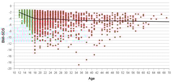 In contrast to absolute BMI, BMI-SDS was markedly lower in adolescents and to a much lesser extent in adult patients (Figure 2). In adolescents, BMI-SDS ≤ −10 occurred in only two 17-year-olds; particularly at age 18 but also thereafter, these exceedingly low BMI-SDSs occurred in small subgroups of patients up to age 51. The three lowest BMI-SDS values were observed in patients aged 35 to 41.