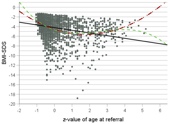 Curve fit analysis for z-value of age at referral as independent variable and BMI-SDS as dependent variable for all patients (n = 1472). Black line: linear equation; red line: quadratic equation; and green line: cubic equation.