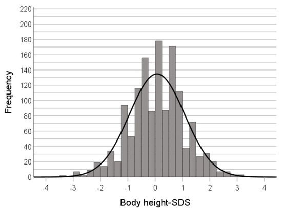 There was a small but significant correlation between BMI and height in adult patients, too (r = 0.1; p = 1.6 × 10−4). The mean body height-SDS was not significantly higher than 0 (0.068, p = 0.01, n = 1370) (Figure 4).